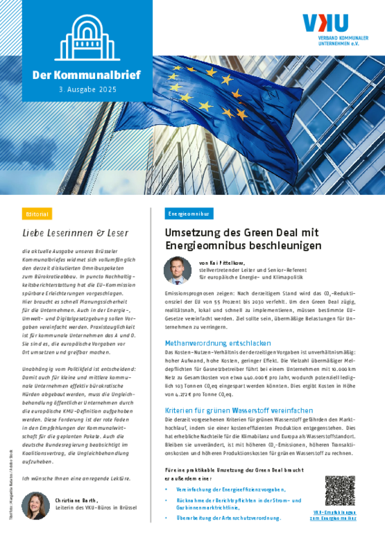 Wir freuen uns, Ihnen anbei die aktuelle Ausgabe des Brüsseler Kommunalbriefs des Verbandes kommunaler Unternehmen (VKU) zukommen zu lassen. Sie greift die Empfehlungen der Kommunalwirtschaft für die geplanten Omnibuspakete in der Energie-, Umwelt- und Digitalpolitik auf.