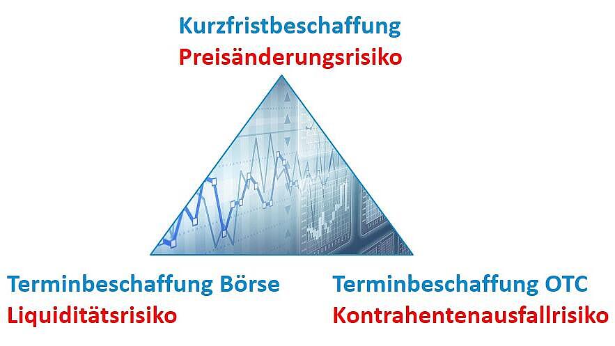 Mit einem Großhandelspreisniveau bei Erdgas von über 200 €/MWh verzeichnet Deutschland eine noch nie dagewesene Preisexplosion. Im Vergleich zum Vorjahreszeitraum ist das eine Preissteigerung um das Acht- bis Zehnfache.Bei der Umsetzung der Beschaffungsstrategie bewegen sich Energieversorger im unten skizzierten Dreieck und müssen abwägen zwischen Liquiditätsrisiken an der Börse durch die dort geforderten Sicherheitsleistungen und Kontrahentenausfallrisiken in der außerbörslichen Terminbeschaffung sowie Preisänderungsrisiken bei der Beschaffung auf den Spotmärkten.