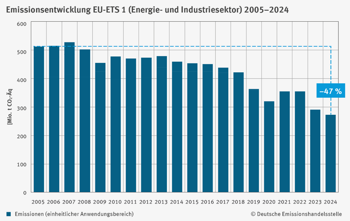Das bestätigt die jüngste Meldung aus dem Umweltbundesamt. Deutsche Anlagen haben seit dem Start im Jahr 2005 ihre Emissionen um rund 47 Prozent gesenkt. EU-weit liegt der Rückgang sogar bei 51 Prozent. Die Erlöse aus dem Emissionshandel fließen in Deutschland vollständig in den Klima- und Transformationsfonds (2024: 18,5 Mrd. Euro).