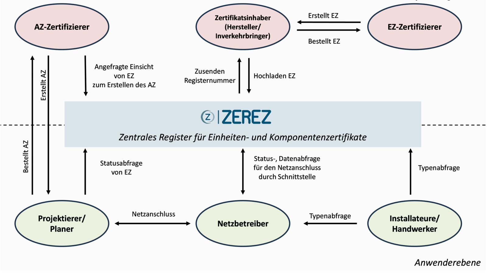 Im April 2024 hat das zentrale Register für Einheiten- und Komponentenzertifikate (ZEREZ) seinen Betrieb aufgenommen. Mit ZEREZ wurde eine zentrale Datenbank für Einheiten- und Komponentenzertifikate von Erzeugungseinheiten aller Spannungsebenen geschaffen. Die Nutzung von ZEREZ ist für Hersteller, Anlagenbetreiber und Netzbetreiber ab 01.02.2025 gesetzlich verpflichtend.