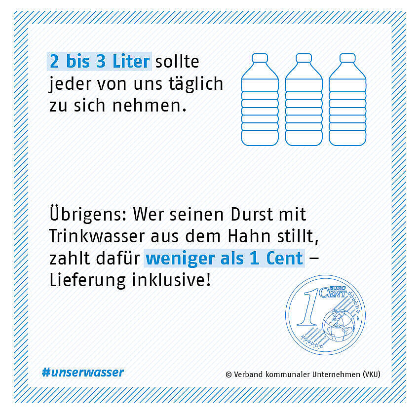 Trinkwasser ist unser wichtigstes Lebensmittel. Zwischen 2 und 3 Liter Flüssigkeit sollte jeder erwachsene Mensch am Tag zu sich nehmen. Mit Trinkwasser aus der Leitung stillen wir unseren täglichen Bedarf dazu noch unschlagbar günstig. Mit weniger als 1 Cent für 3 Liter Trinkwasser müssen wir uns auch in Zukunft keine Sorgen machen, uns den erfrischenden Schluck aus der Leitung noch leisten zu können.