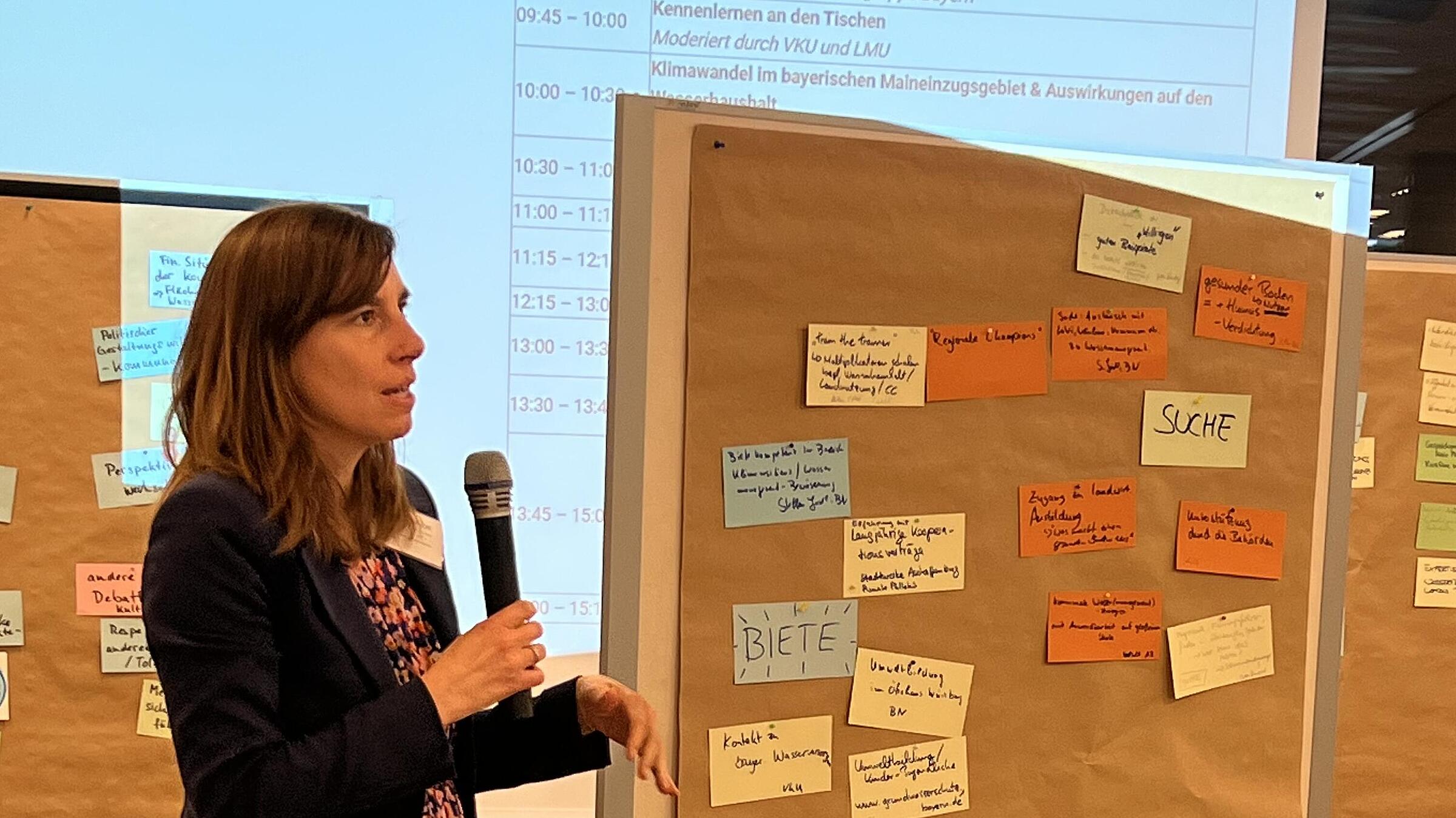Marion Zilker stellte vor, wie man im Projekt gemeinsam mit einem großen Kreis von Stakeholdern aus Wirtschaft, Gesellschaft und Verwaltung Folgen des Klimawandels für das Leben in der Region erfasst und Anpassungspfade entwickelt hatte. Zwar sind die Auswirkungen der Klimaveränderung extrem und es besteht großer Handlungsdruck aber es gibt auch zahlreiche Handlungsmöglichkeiten. Wichtig ist, dass bald und entschlossen an einer flächendeckenden Klimaanpassung gearbeitet wird. Aktuell beklagen viele Menschen aus der Region ein Handlungsdefizit. Aus diesem Grund waren im Projekt Hürden und begünstigende Faktoren für die Klimaanpassung in Städten, auf dem Land erforscht worden. Außerdem wurde ein Blick auf die die Klimaanpassung unterstützenden Abläufe in der Verwaltung geworfen. In allen Bereichen gilt: Klimaanpassung braucht starke politische Rückendeckung, Finanzierung und ein Umdenken, dass Wasser und Resilienz höheren Stellenwert gibt.