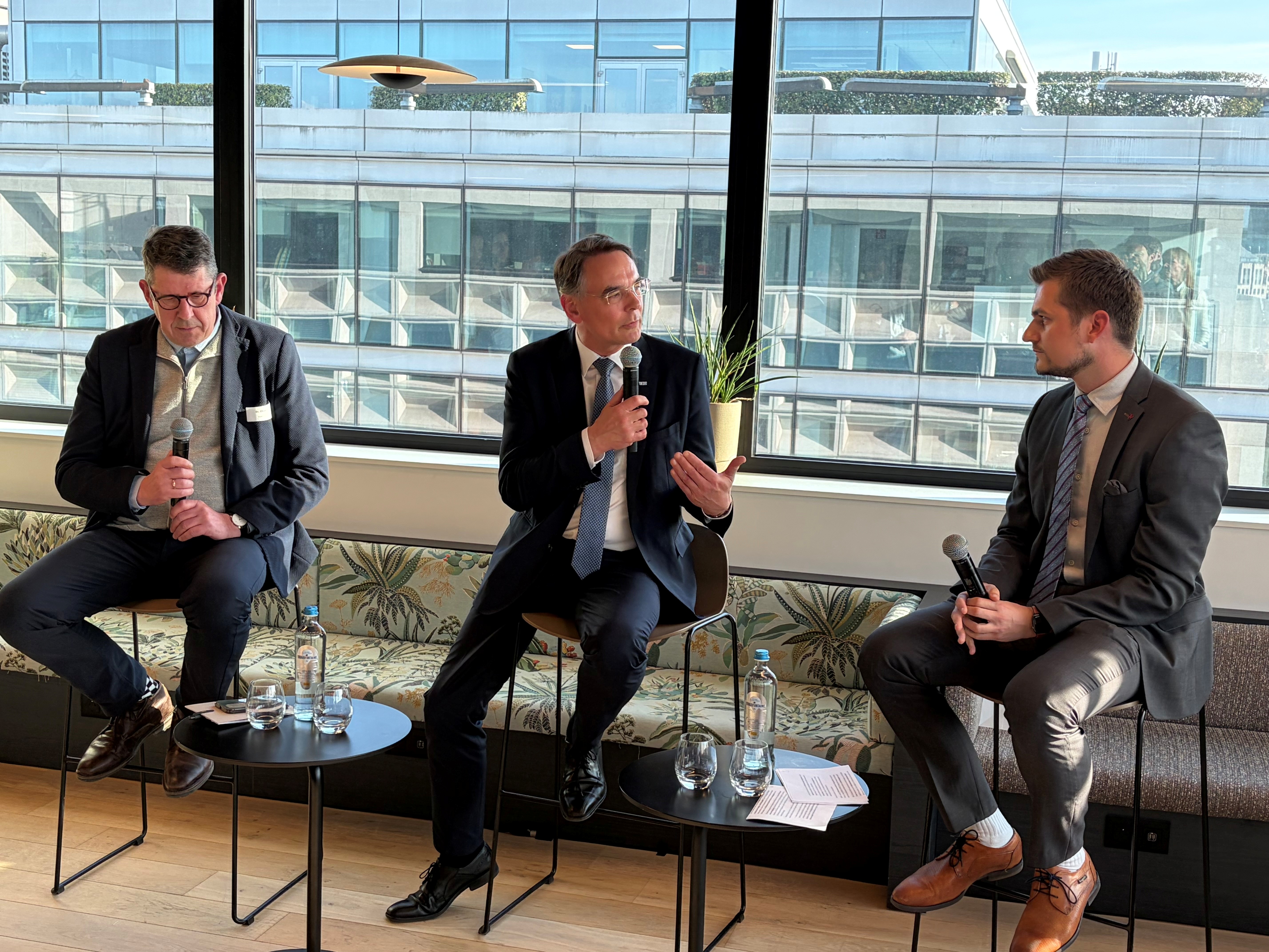 Im Austausch mit Till Spannagel, Leiter der Abteilung Wirtschaft der Ständigen Vertretung Deutschlands zur Europäischen Union, sowie mit dem Europaabgeordneten Christian Ehler, Koordinator der Europäischen Volkspartei im Ausschuss für Industrie, Forschung und Energie (ITRE), standen insbesondere Anpassungen im EU-Beihilferecht, die Omnibus-Pakete in den Bereichen Energie und Umwelt sowie der für Brandenburg besonders wichtige Net-Zero Industry Act im Fokus.