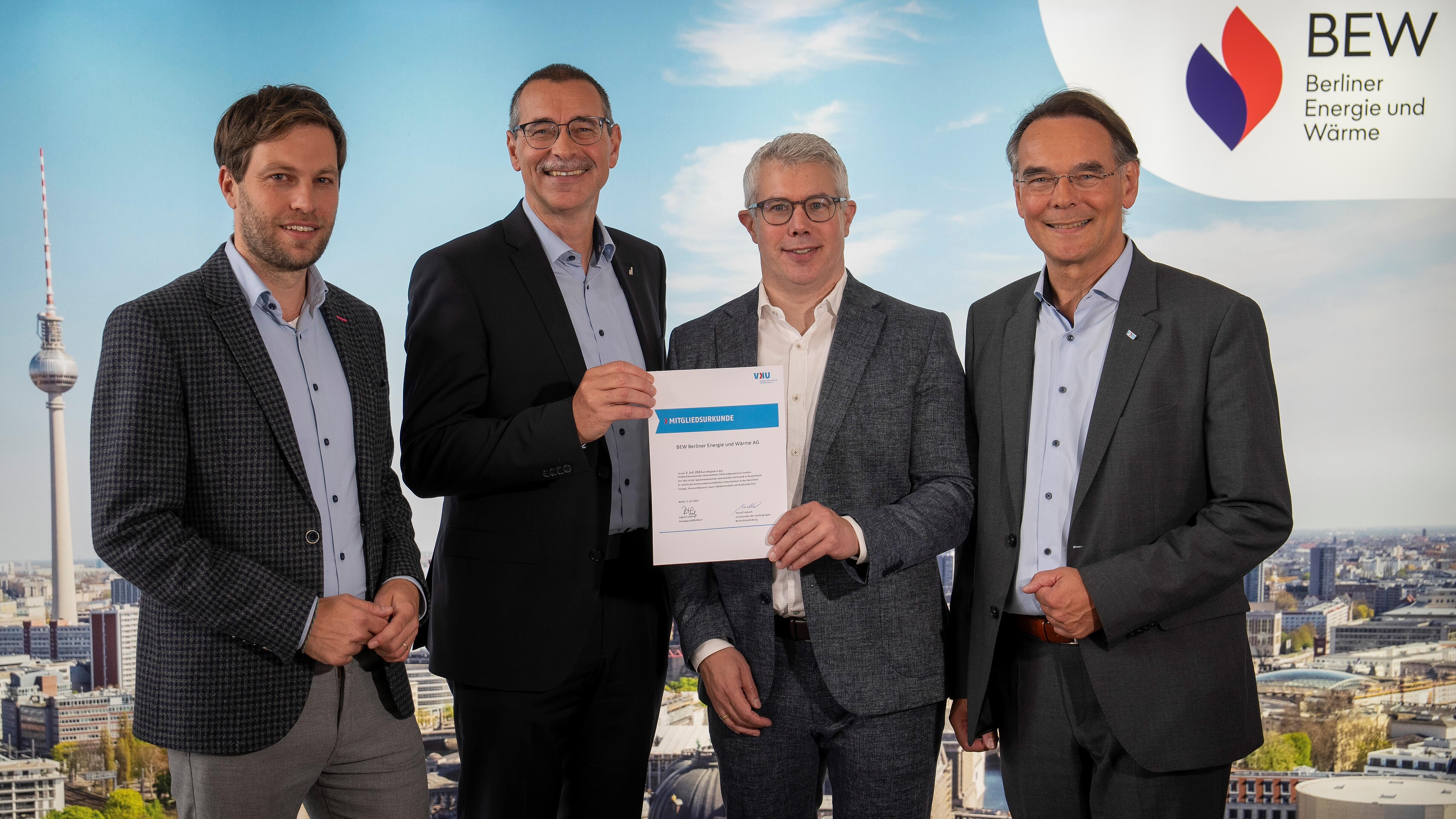 Gemeinsam mit dem VKU-Hauptgeschäftsführer Ingbert Liebing haben der Landesgruppenvorsitzende Thoralf Uebach und der Landesgruppengeschäftsführer Julian Büche die Urkunde zur VKU-Mitgliedschaft an Herrn Axel Pinkert, Finanzvorstand (CFO) BEW AG, überreicht und im VKU herzlich willkommen geheißen.