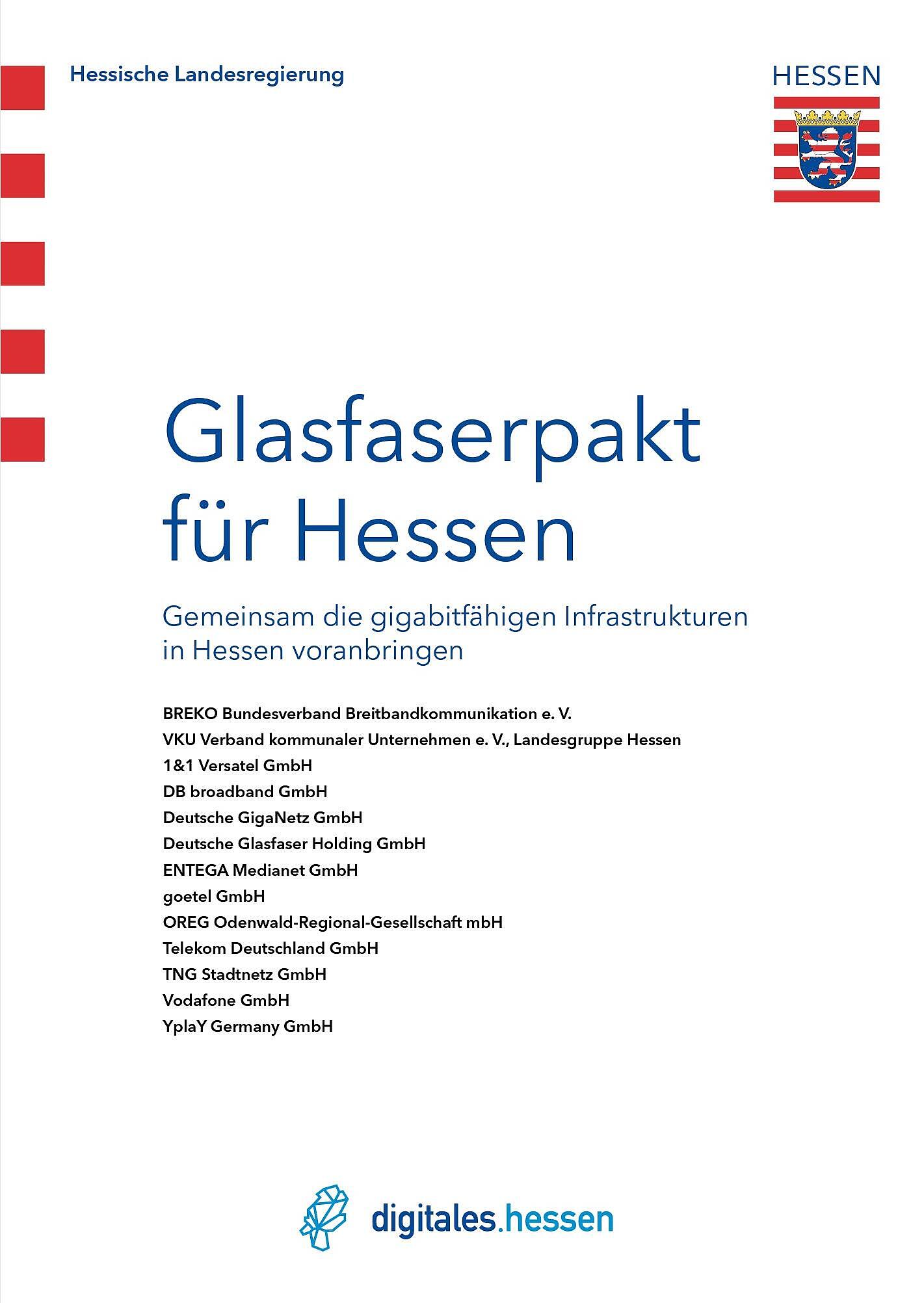 Wiesbaden, 13. Mai 2022. Um den flächendeckenden Glasfaserausbau voranzutreiben und Hessen zukunftssicher aufzustellen, hat die Hessische Landesregierung heute zusammen mit elf Telekommunikationsunternehmen (TKU), der hessischen Landesgruppe des Verbandes kommunaler Unternehmen (VKU) und dem Bundesverband Breitbandkommunikation e.V. (BREKO) den Glasfaserpakt für Hessen unterzeichnet.