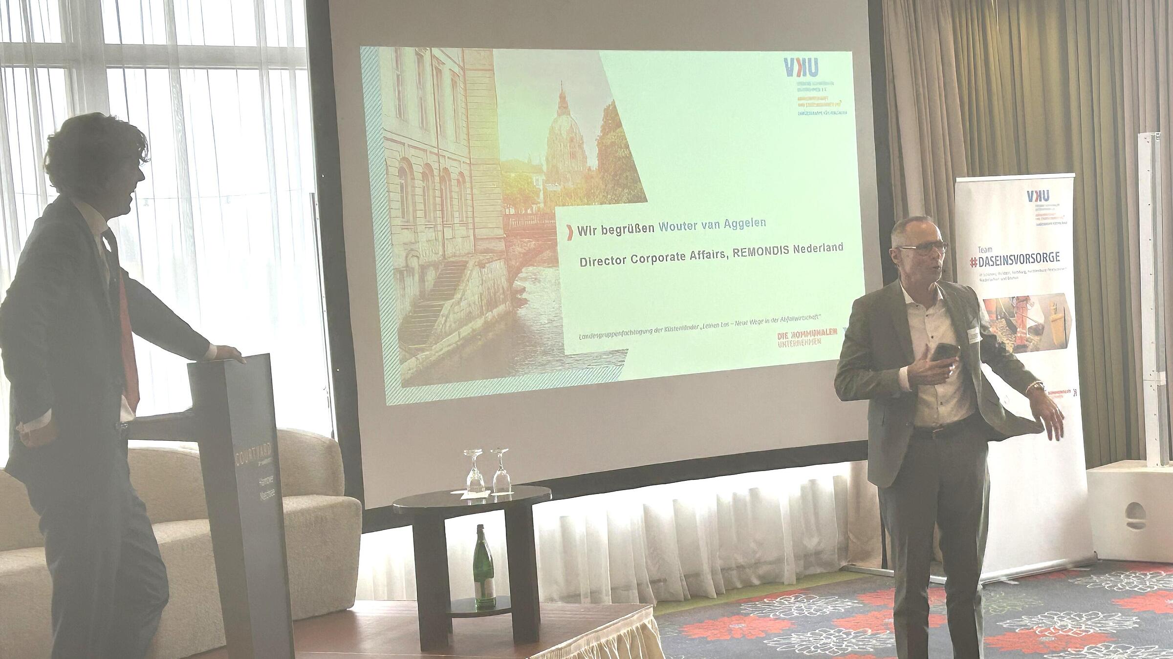 Der nächste Block „Ein Blick über den Deich“ , eingeführt von Christian Niehaves (AWIGO Abfallwirtschaft Landkreis Osnabrück GmbH), bot eine Gelegenheit, den Blick auf unsere Nachbarländer zu richten. Wouter van Aggelen (Director Corporate Affairs, REMONDIS Nederland) berichtete in seinem Vortrag über das innovative Windel-Recycling, bei dem u.a. gewonnenes Kunststoffgranulat für die Herstellung neuer Plastikprodukte verwendet werden kann. Zudem wies er darauf hin, dass die Niederlande ab dem Jahr 2025 eine Quote von 50 Prozent für die Wiederverwendung und Recycling von Textilien anstreben. Pim van Keep von SLB Capturi betonte, dass der Handel mit CO2-Abscheidungen einen eigenen, wirtschaftlichen Markt darstelle. Ronald de Vries (Twence B.V.) nannte konkrete Beispiele aus seiner Firma, um die Verwertung von abgeschiedenem CO2 mit der CCU-Technologie zu illustrieren. So wird das Gas nicht nur in Gewächshäusern genutzt, sondern dient auch zur Herstellung von Trockeneis. Über die aktuellen politischen Entwicklungen aus Brüssel referierte Anna Lena Wacker vom VKU e.V.