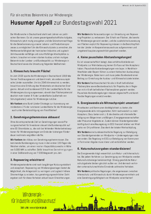 In dieser Woche fand vom 14. bis zum 17. September 2021 die deutsche Windleitmesse HUSUM Wind statt. Der VKU Nord war durch den Geschäftsführer Moritz Schibalski sowie durch die Referentin Ronja von der Heydt in Husum vertreten. Neben den neusten Entwicklungen der Windenergiebranche ging es in den Gesprächen am Rande vor allem um den Ausbau der Erneuerbaren Energien, um Klimaschutz und die Betonung der zentralen Rolle der Kommunalwirtschaft im Norden.