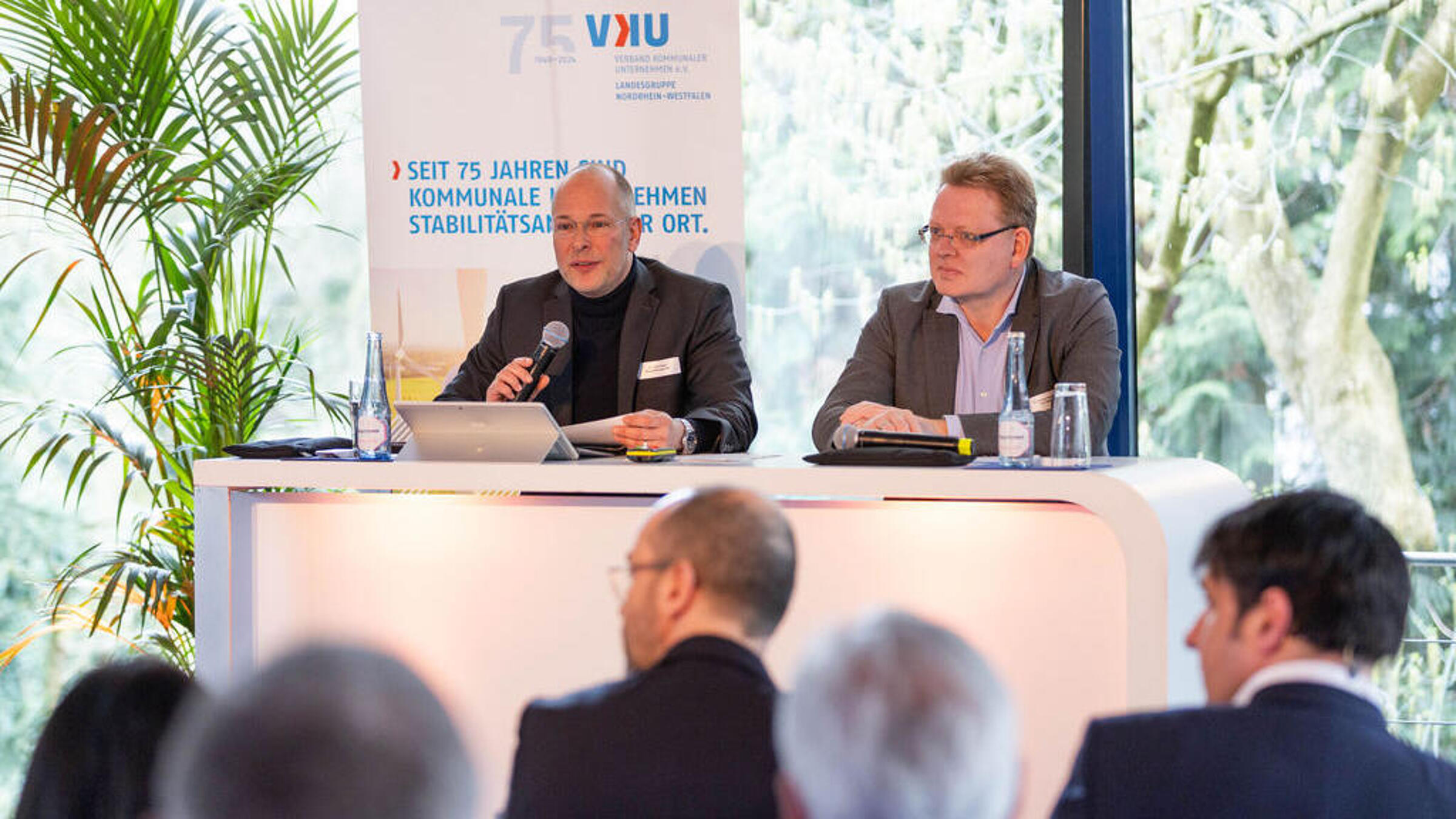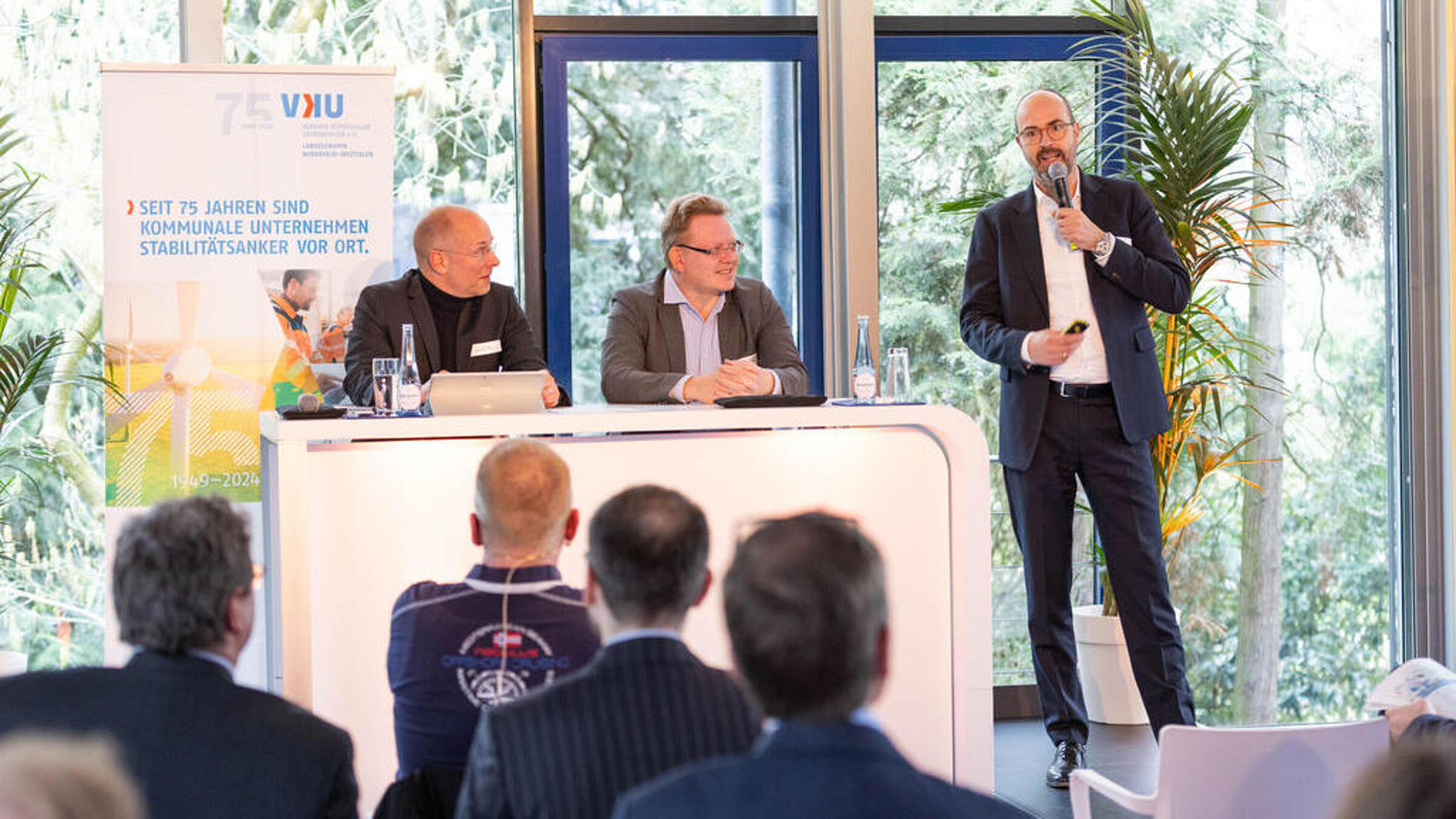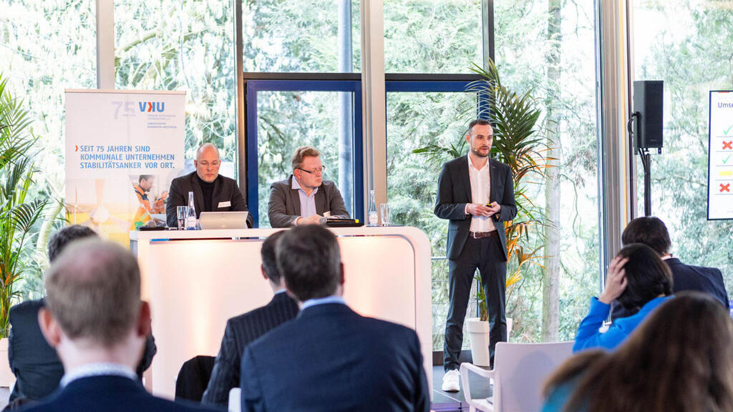 Als nächstes stellte Gastgeber Till Cremer, Vorstand der rhenag, kurz das Unternehmen und seine Geschäftsfelder vor. Daran schloss sich Florian Feldhoff, Referent Wärmemarkt aus der VKU-Hauptgeschäftsstelle, mit einem politischen Blick auf Berlin an. Nach einer kurzen Rückschau über Vorhaben, die in der vergangenen Legislaturperiode zum Teil umgesetzt und zum Teil liegen geblieben waren, berichtete er zu Gerüchten, Updates und Neuigkeiten aus der AG "Energie und Klima" der Koalitionsverhandlungen und gab damit wertvolle Einblicke in die politische Stoßrichtung der künftigen Koalitionäre.