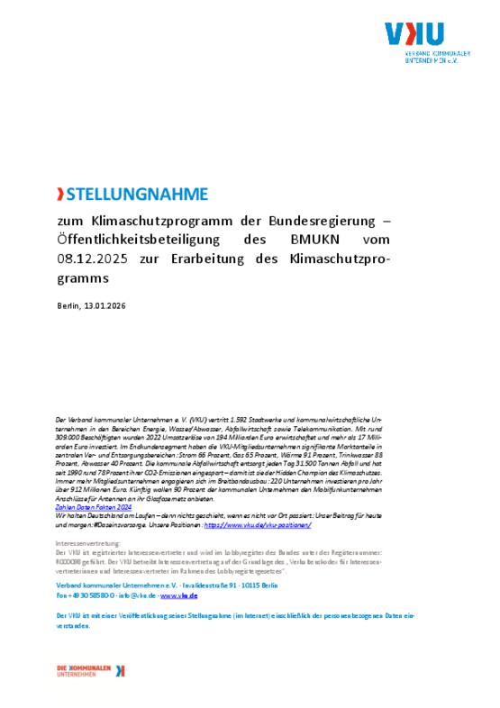 VKU-Stellungnahme zum Klimaschutzprogramm der Bundesregierung – Öffentlichkeitsbeteiligung des BMUKN vom 08.12.2025 zur Erarbeitung des Klimaschutzprogramms