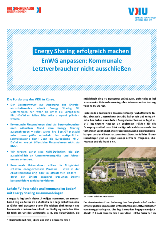 Kommunale Unternehmen sollten die Möglichkeit erhalten, energieintensive Prozesse – etwa in der Abwasserbehandlung oder in öffentlichen Bädern – durch den Einsatz dezentral erzeugten Stroms kosteneffizient zu dekarbonisieren.