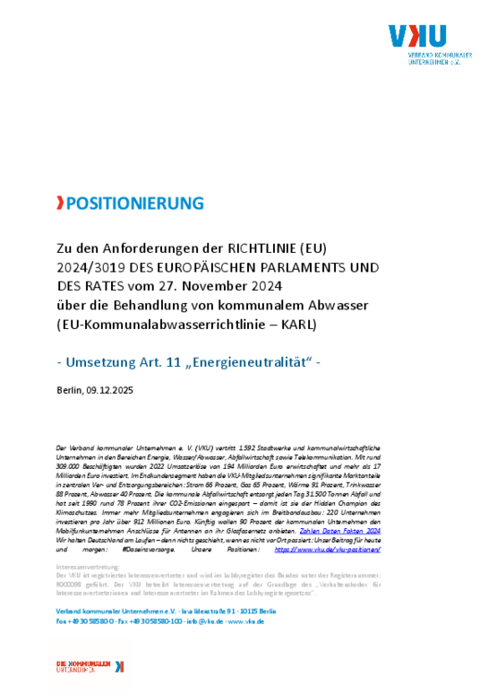 - Der VKU fordert eine 1:1-Umsetzung der europäischen Vorgaben. Der nationale Gesetzgeber darf keine weiteren Verschärfungen vornehmen und muss bestehende rechtliche Spielräume der Richtlinie nutzen, damit die Betreiber/Eigentümer kommunaler Abwasserbehandlungsanlagen die Zielvorgaben erreichen können.