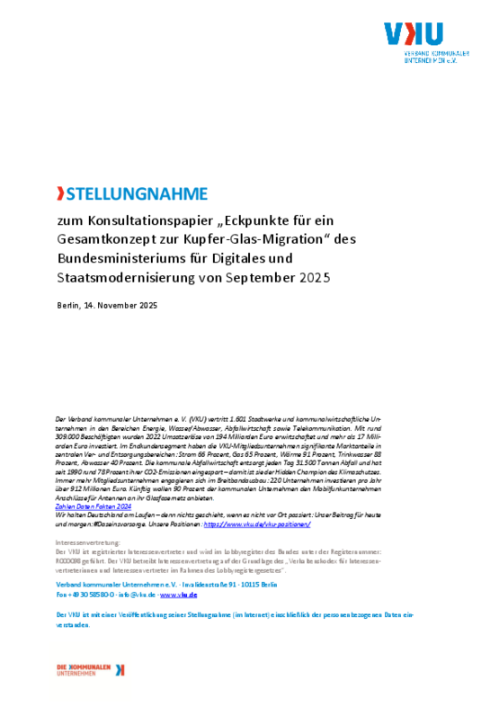 Der VKU begrüßt die Bestrebungen des Bundesministeriums für Digitales und Staatsmodernisierung für eine möglichst zeitnahe und diskriminierungsfreie Kupfer-Glas-Migration mit regelgebundenem Abschalteverfahren. Die hierauf einzahlenden Eckpunkte legen eine vielversprechende Basis für eine Glasfaserwelt mit nachhaltigem Wettbewerb, von dem neben der Gesamtwirtschaft auch die Verbraucher profitieren.